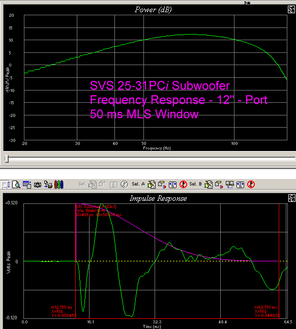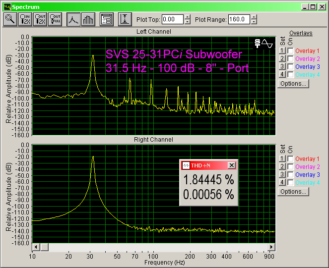 The round column shape of the 25-31 is a problem for wives. Let's face it, this is not something that fits into an average decor. However, the shape is actually one of the best for speakers, because the non-parallel sides attenuate internal standing waves. So, there is more to this sub than just the fact that some standard tubing can be cut to 31" long, put in the driver plate and port plate, and amplifier to finish its construction and keep the cost down. There are engineering reasons too. Personally, I don't have an issue with the looks, but I am not a bachelor. The only concern I have with the design at all is that the port is open at the top through the perforated metal plate, and you could spill something into the subwoofer. So, I would suggest putting it somewhere that a guest is not likely to place a wineglass on it, and do not put it under any shelves that have potted plants on them. Over-watering the plants could result in spillover right into the subwoofer. The Sound I tested the 25-31 in a home theater setting, using a McIntosh MVP851 DVD Player, Theta Casablanca II Processor, Cinepro 3k6 SE Gold Power Amplifier, Threshold ES-500 Electrostatic Speakers, Monitor Audio Studio 20 SE Speakers, Krix Esoterix I MkII Speakers, Nordost Cables, BetterCables, Sony 10HT Projector, and Stewart Grayhawk Screen. My favorite movies for video are also my favorite for sound. For example, "Star Wars I" has the Pod Race, and there are plenty of very deep engine sounds that will show what a good subwoofer can do. Not only that, but I run the bass through an Audio Control unit that generates sub-harmonics at 1/2 the frequency of the original. The SVS handled all those sounds beautifully. If there is much distortion, the sound will be boomy. Nope, nothing but the deep rumble of the engines here. And loud enough to wake up a parking meter too. The attack scenes in "Pearl Harbor" are the best depiction of this tragedy that have ever been filmed. From the first torpedo explosion to the USS Arizona coming apart with ammunition storage being detonated, it is just one jaw dropping moment after another. Again, the 25-31, which looks a bit like a torpedo itself, sailed along with the special effects, never sounding overdriven. I just wish I could saddle the hurricane coming out of the SVS port to be part of the special effects somehow. On the Bench Here are the reasons the 25-31 does so well. Even at 20 Hz, which is a killer for many subwoofers, the SVS only produced 3.37% THD, at 100 dB, 8" from the port. There appeared to be about the same amount of even-ordered as odd-ordered harmonics. By the way, I found that up to about 35 Hz, the SVS moves most of its air from the port. At 40 Hz and above, it comes out of the base where the driver is. So, I placed the microphone accordingly.