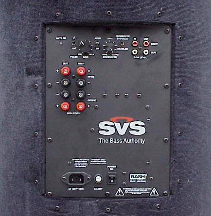 The amplifier is mounted on the side of the enclosure (shown below). It is full featured, with volume, phase, auto on/off, line-level in-outs, speaker-level in-outs, and detachable power cord. It also has a switch so that you can disable the 40 Hz - 120 Hz variable low-pass crossover, which is what I did for the bench tests.