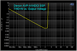 THD+N vs. Output shows that somewhere close to 3 volts RMS is the maximum output. An average listening power output with reasonable volume would be about 500 mV on any one channel of the SSP, and a typical power amplifier has an input sensitivity of about 1.5 volts to drive it to full output.