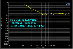 THD+N vs. Frequency indicates that the ULS-15 stays at 10% THD+N or less from about 14 Hz to 200 Hz.