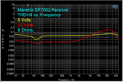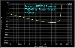 THD+N vs. Frequency showed pretty good performance at both 8 ohms and 4 ohms. This receiver should be able to drive 4 ohm speakers, but just don’t go overboard on the volume control.