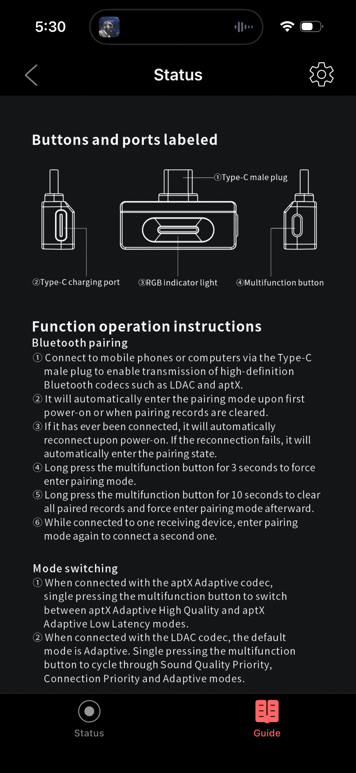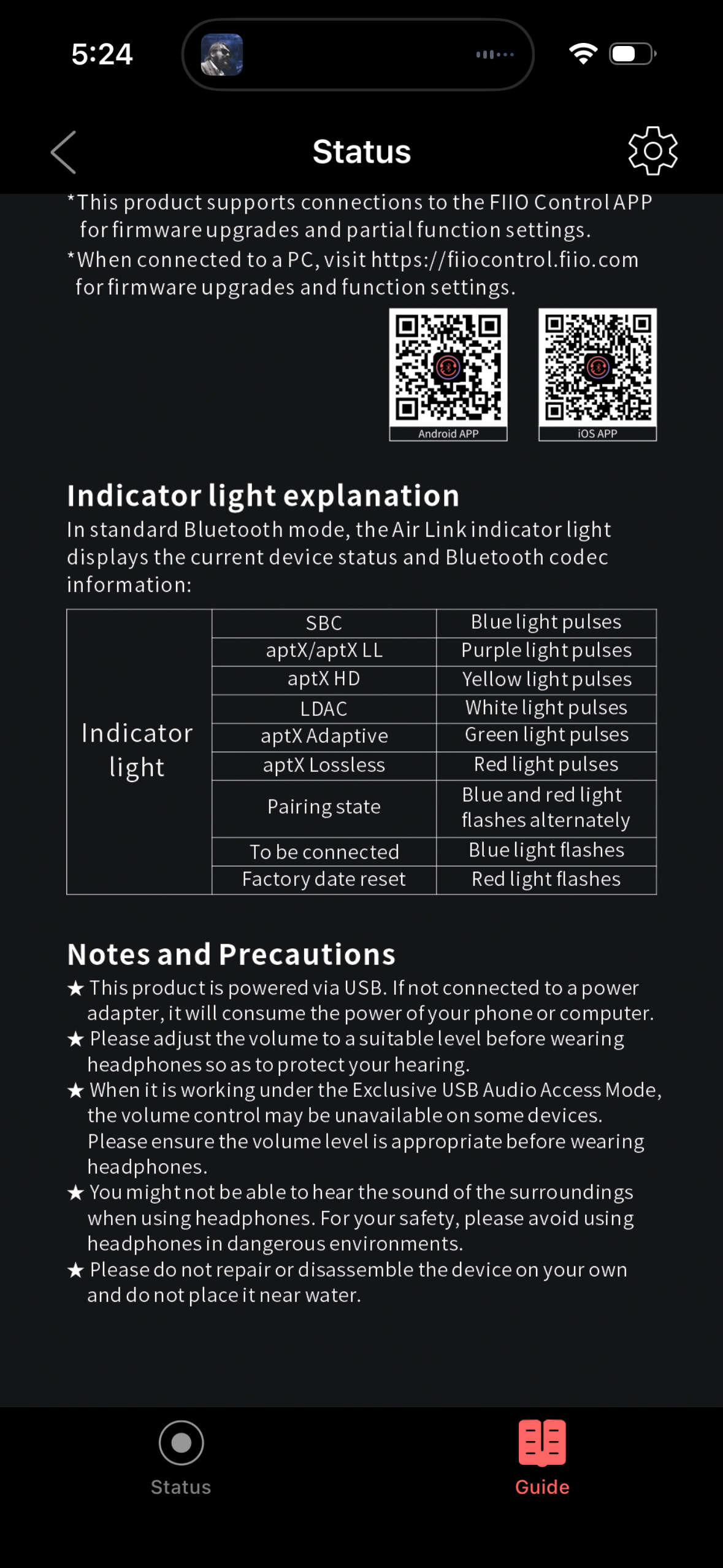 The Air Link is packaged in a small cardboard box. Inside, tucked tightly in a black foam case, is the Air Link and a USB-A to USB-C adaptor. A small accordion-fold, multi-language warranty card and a quick-start guide are included. The quick-start guide can also be downloaded from the FiiO website, which I recommend unless you have the eyes of a 12-year-old. The guide is also available on the FiiO Control app when the Air Link is paired with it. The guide includes a chart that explains which colored light represents which codec.