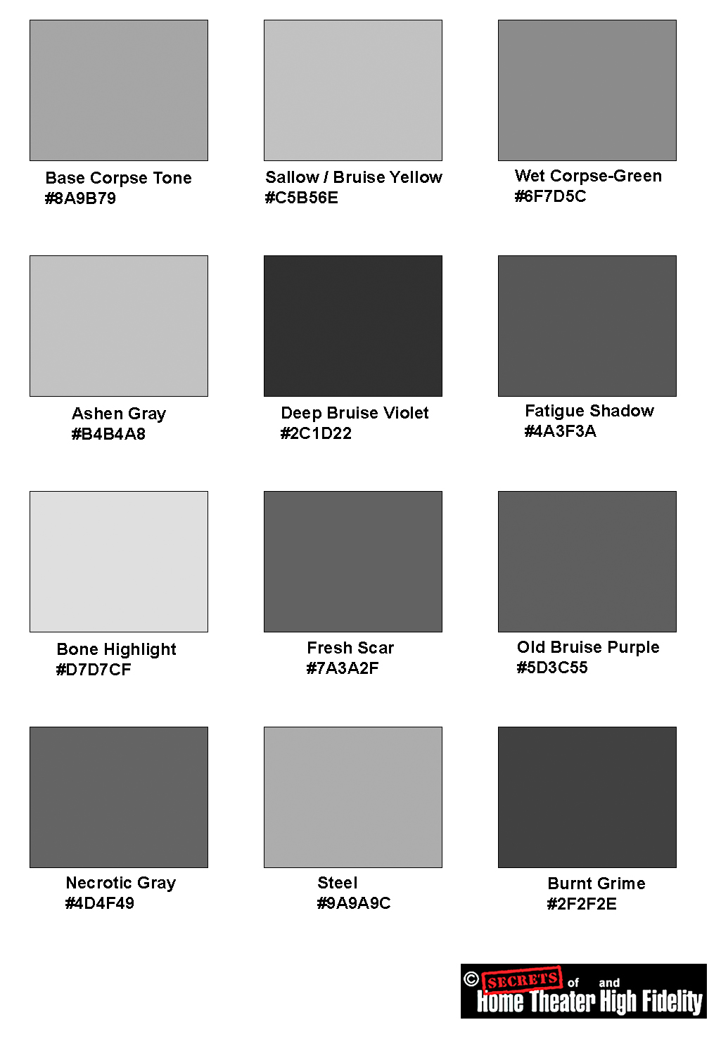 Accurate Digital Color Palette — Frankenstein (1931) (Colors chosen to match preserved makeup notes, photos, stills, and historian reconstructions.)
