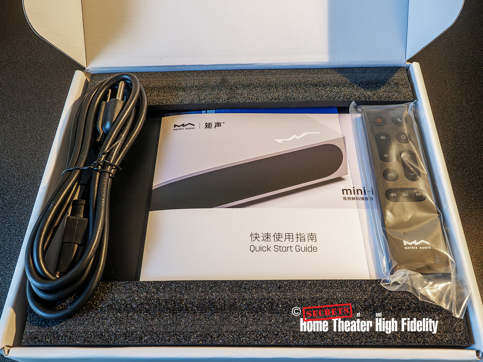 The packaging is straightforward and, along with the mini-i Pro 4, includes the power cord, remote, manual, warranty card, and Roon trial offer card.