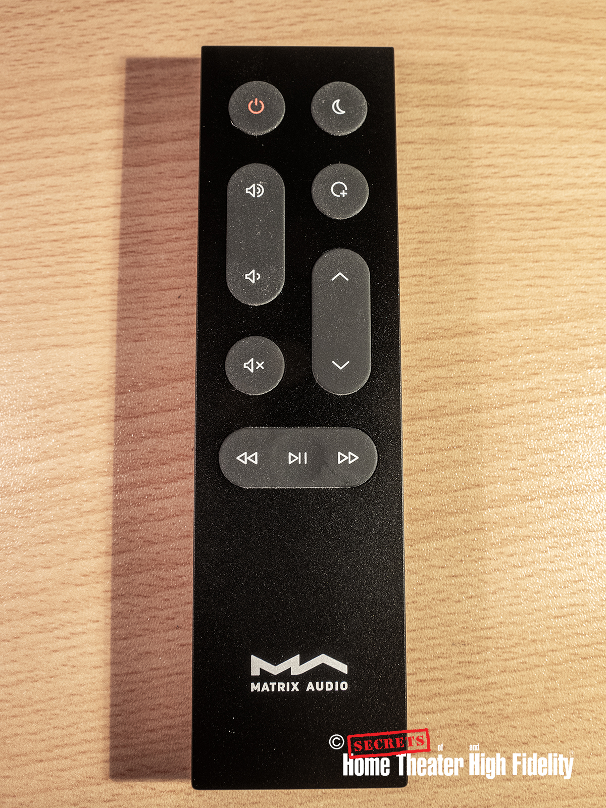 The included remote mirrors the design of the mini-i Pro 4. It is compact with a black metal front and black plastic back, black buttons with small contrasting symbols, and the white Matrix Audio logo along the bottom. It provides the basic controls, including volume/mute, track and function selection, pause, and a “visual mute” button to completely turn off the display while listening to music. Everything on the front display disappears, and even the illuminated logo turns off. I appreciated the absence of visual noise when listening in a dark room. The remote is powered by a CR2032 battery, which is not included.