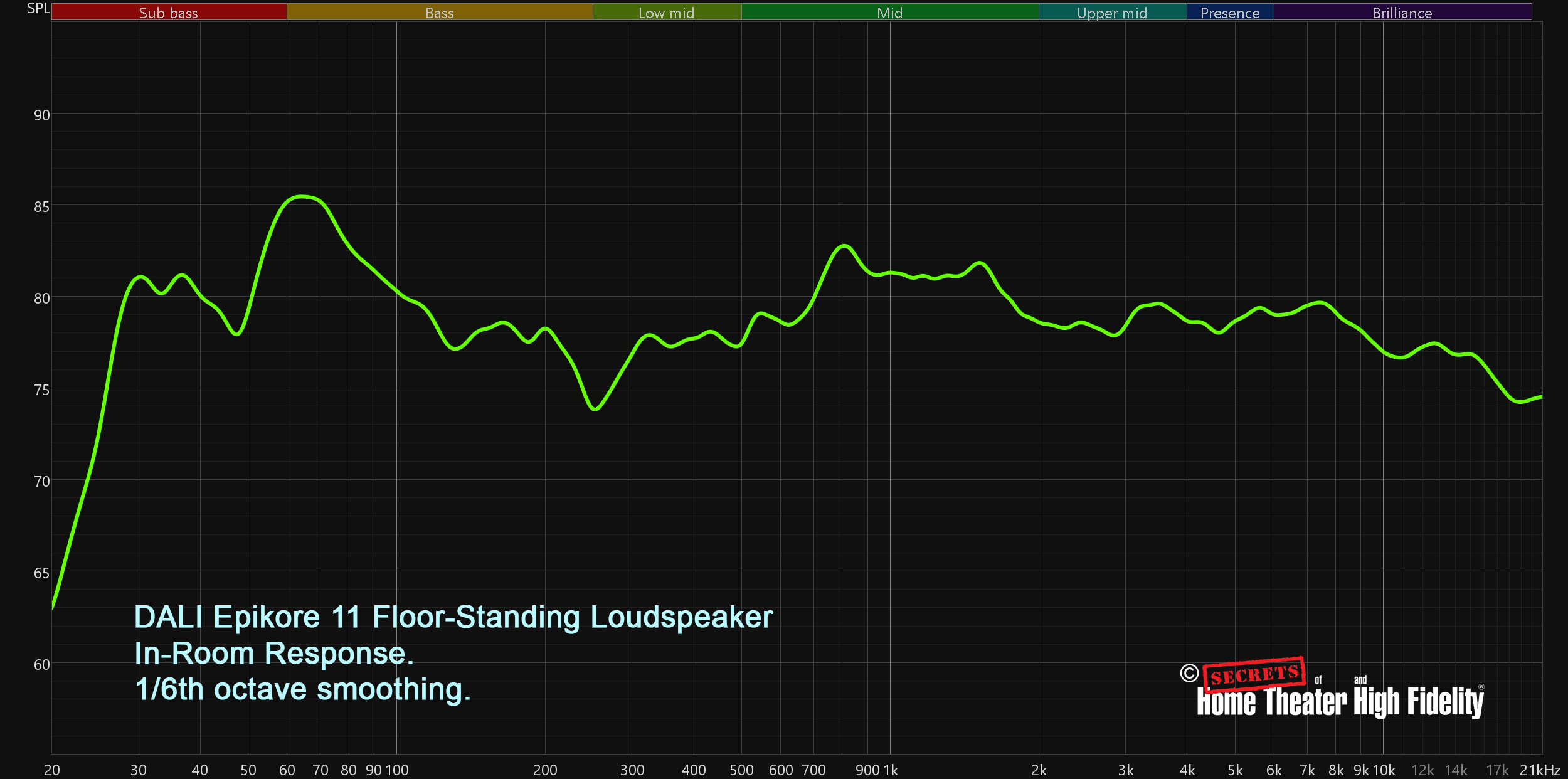 This in-room measurement of the DALI Epikore 11 tower speakers is an 18-point spatial average. A 9-point measurement was made for the right speaker and then repeated for the left speaker. Averaging both speakers is an approach others have been using and publishing. Using data from both speakers reduces the modal response of the room by averaging the differences in the response of the two speakers from room asymmetries. The technique cannot eliminate them, however, and so the response below 300Hz remains room-dominated. As you can see from the graph, the speaker and room interaction is causing a noticeable bump in the 60 -70 Hz area, resulting in extra punch to electric /acoustic bass, kick drums, and such. Above this area, there is a broad response dip between 125 Hz to 500 Hz. While there may be some intentional voicing in this, it is mostly due to room interaction from a tall speaker with bass drivers both at the top and bottom of the cabinet, placed in a room with lower-than-average ceilings. The 250 Hz dip is likely a floor bounce interaction. There is also a severe dip in this room at precisely 20 Hz, which is why there is such a steep drop below 27 Hz. This affects every loudspeaker tested in here and is only overcome by using a pair of powerful subwoofers. Without that issue, it is likely the Epikore 11’s bass response would easily extend below 20 Hz in a more forgiving listening space.