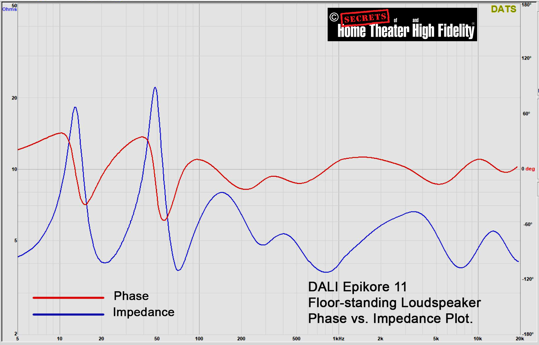 Here we have the Impedance sweep for the DALI Epikore 11. The results show that the speaker remains below 5 Ohms from 18 Hz to 29 Hz, from 60 Hz to 90 Hz, from 250 Hz to 1500 Hz, from 5.2 kHz to 11 kHz, and from 16 kHz to 20 kHz. There are peaks as high as 17 ohms at 14 Hz and 23 Ohms at 48 Hz, respectively. The speaker hits an impedance low of 3.7 Ohms at 70 Hz and 800 Hz. The DALI Epikore 11 specifications rate its nominal impedance as 4 ohms, which is quite accurate.