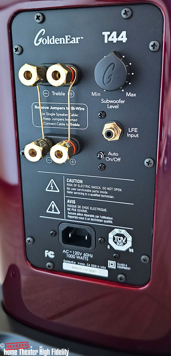 Located near the base of the rear panel, the T44’s connectivity section is cleanly organized and logically arranged. It features high-quality dual five-way binding posts that accommodate both single-wire and bi-wire configurations, with the loudspeakers shipped in a default single-wire configuration using the supplied jumpers. Also housed on this panel are the AC power inlet required for the onboard bass amplifier and a dedicated subwoofer level control for fine adjustment of low-frequency output. Enhancing system flexibility, the T44 includes a mono line-level LFE (Low-Frequency Effects) input, enabling direct connection to the .1 channel output of an AV receiver or processor. It should be noted that this LFE input is intended to supplement, not replace, the speaker-level connections, which must remain connected for proper operation of the full-range loudspeaker system.