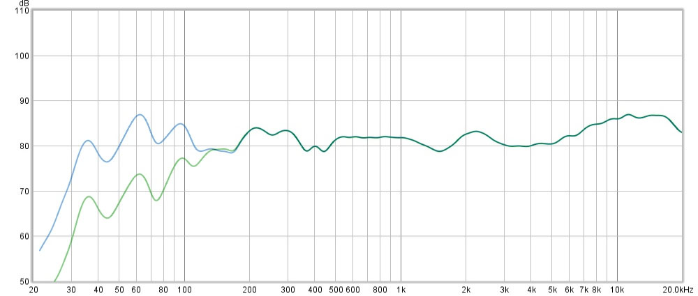 The in-room, on-axis nearfield frequency-response measurements of the T44, obtained using REW software and a calibrated measurement microphone, reveal a remarkably flat response from approximately 150 Hz to 6 kHz. As shown in Figure 5, with the internal subwoofer amplifier disengaged, the T44 exhibits a noticeable bass roll-off below roughly 80 Hz. When the subwoofer is engaged, low-frequency extension improves substantially, reaching down to about 30 Hz—adequate for most listening applications without the need for a separate subwoofer.