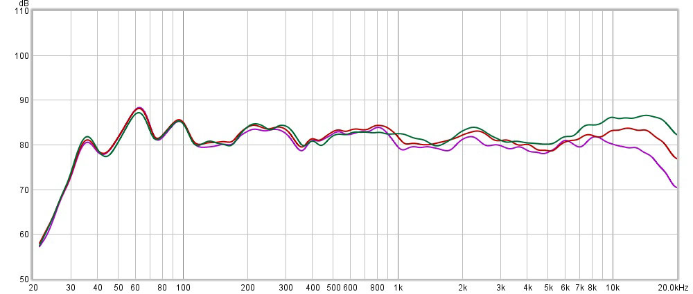 Comparison of nearfield (2 ft) frequency response of the GoldenEar T44 loudspeaker on axis (green curve) and horizontally off axis at 30o (red curve) and 45o (purple curve) angles