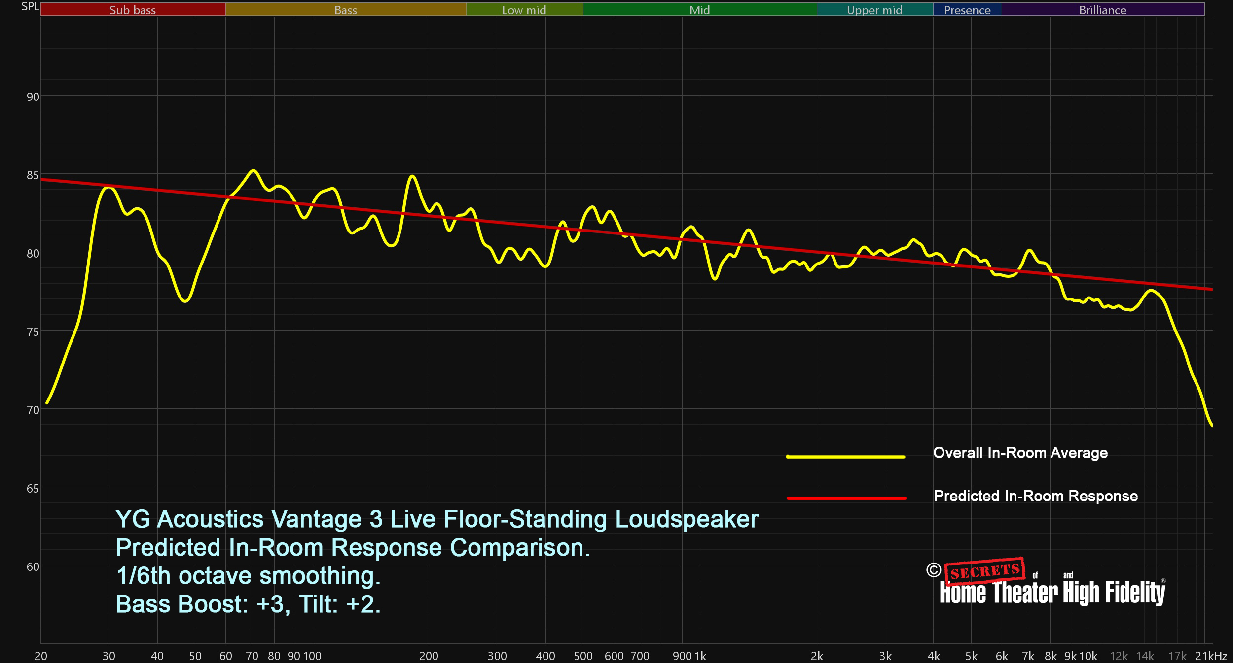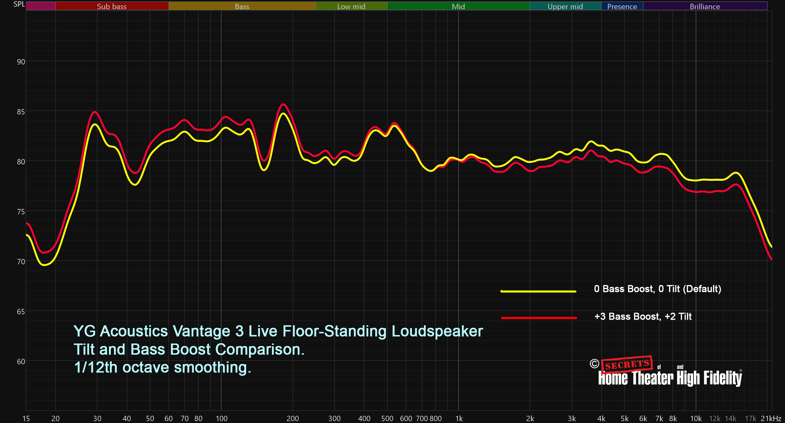 YG gives the option to change the slope through settings found in the preamp/controller unit. Carlo did produce a graph (below) showing the difference between the Vantage 3 Live’s “default” in-room response (0 – Bass Boost, 0 – Tilt) against his preferred Bass Boost and Tilt settings