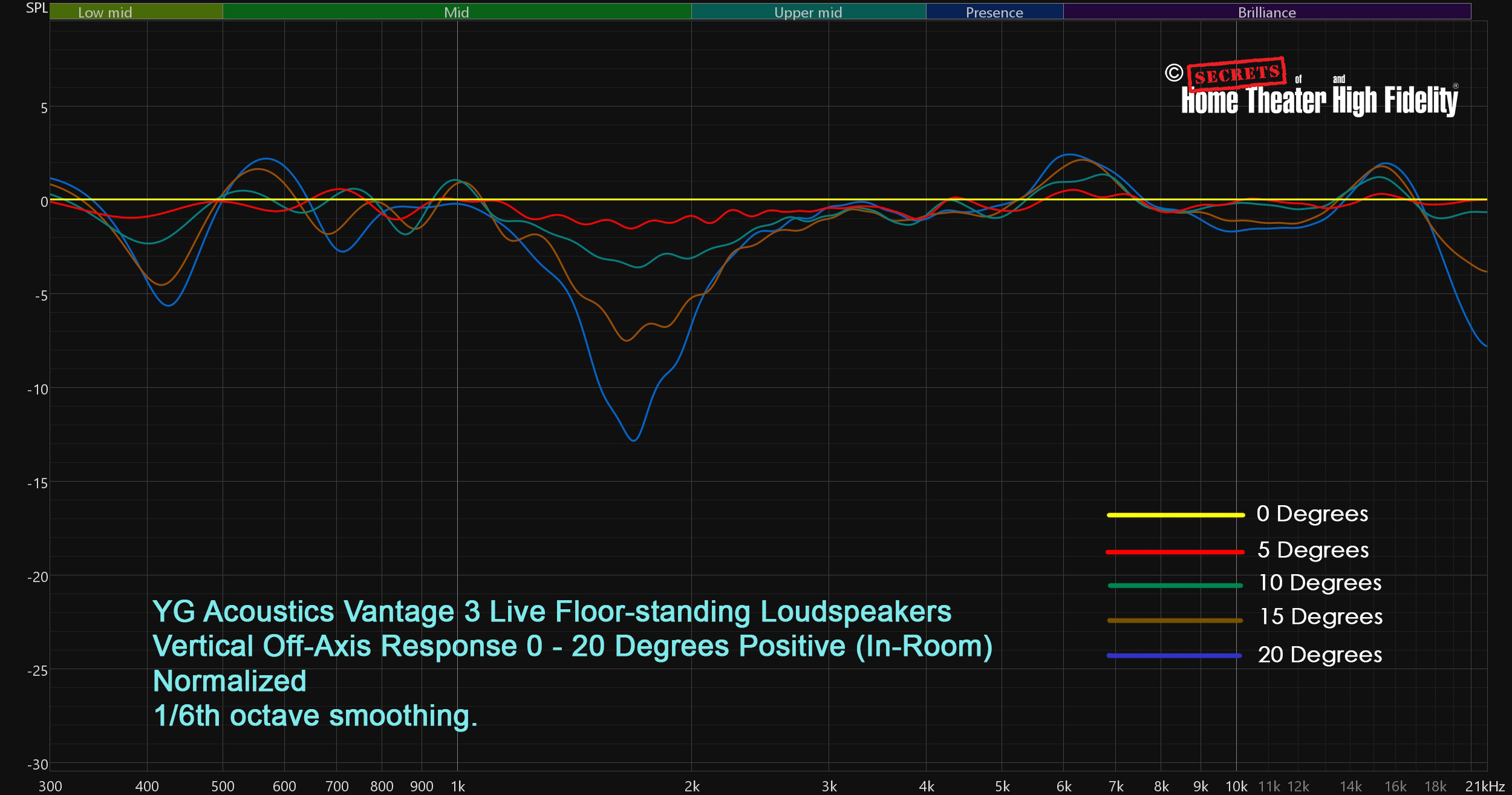 YG has been using waveguides on the tweeter for a long time. From this curve, it might lead one to assume that the crossover is at 3 kHz with a small snap back at the smaller radiation angles. 3 kHz appears to correspond to the level rise in the NRC and CEA2034 radiation patterns. Yet as we will see below in the vertical response, the actual crossover frequency appears to be closer to 2 kHz with an almost perfect match at all angles.