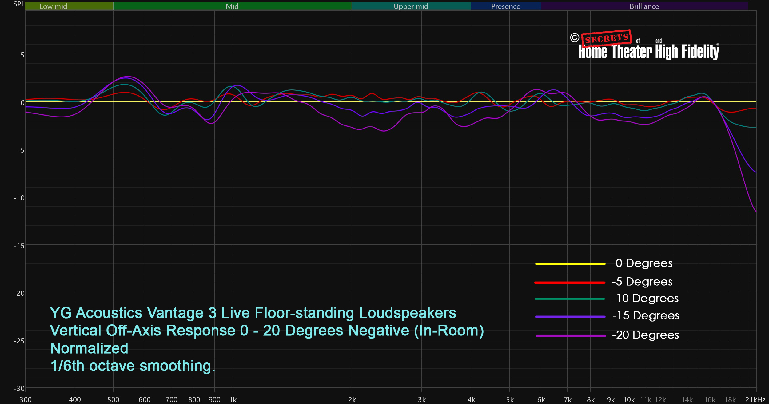 This in-room measurement of the YG Acoustics Vantage 3 Live tower speakers is an 18-point spatial average. A 9-point measurement was made for the right speaker and then repeated for the left speaker. Averaging both speakers is an approach others have been using and publishing. Using data from both speakers reduces the modal response of the room by averaging the differences in the response of the two speakers from room asymmetries. The technique cannot eliminate them, however, and so the response below 300 Hz remains room dominated.