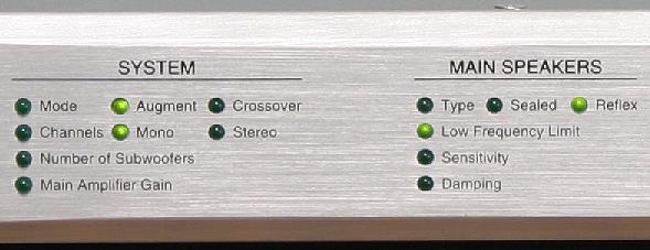 For Channels, you can choose between Mono and Stereo. If Stereo, then you connect two sets of inputs and outputs on the rear panel instead of just one if you choose Mono. Either way, though, you can use just one subwoofer, which is the next item in the menu. You can have multiple subs, up to 16(!). The Main Amplifier Gain is a number that represents the amount of dB gain between input and output of your power amplifier. It goes up to a maximum of 40. In the Main Speakers Menu, you set the Type as either Sealed or Reflex (ported or passive radiator), the Low Frequency Limit as the frequency that your main speakers have at their 3 dB down point (speaker specifications usually list this as the frequency response ± 3 dB, so you use the frequency at the - 3 dB number in this specification). The Sensitivity is next, which would be something like 87 dB in your speaker specifications sheet. The Damping Factor (the "Q") of your speakers is dialed in next in the menu. It ranges from 0.5 to 0.9. If your speaker spec sheet does not list it, you can use 0.8 for sealed enclosures and 0.7 for ported (reflex) enclosures. In the middle of the panel are the Readout, shown below as "20" with respect to the Low Frequency Limit LED that is active in the Main Speakers Menu shown above, and then the LED indicators for a category called "Performance". The Low Frequency Extension setting is for how low you want the subwoofer to play. So, this is the subwoofer cutoff frequency. It will limit low frequencies in subwoofers that have trouble with, say, reproducing anything below 25 Hz, and can improve the performance of such subs. The Crossover Frequency setting is used when you select Crossover in the System Menu. Setting it to, say, 60 Hz (you can select from a range between 40 Hz and 99 Hz), will send all frequencies above 80 Hz to your main speakers and all frequencies at 80 Hz and below to the subwoofer. You would use this most often with bookshelf speakers rather than floor-standers. The LFE Level lets you have a separate path for LFE signals from receivers than the low frequencies going to the main speakers. Its level adjustment is used to balance LFE bass with main speaker bass.