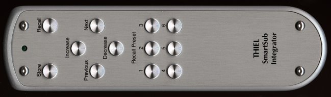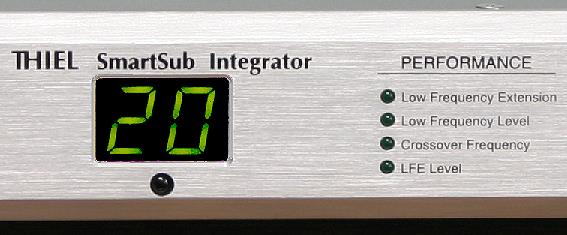 Introduction So, what often happens is that the deep bass is there, but it sounds like a separate component rather than being "integrated" into the whole sound. In conjunction with Thiel Audio's recently introduced SmartSub SS1, SS2, SS3, and SS4 subwoofers, they also have introduced the SmartSub SI-1 Subwoofer Integrator, which is designed specifically to solve the problems mentioned above. The SI-1 is for use only with Thiel subwoofers. We reviewed the SS2 subwoofer using the Integrator, and now report specifically on the Integrator itself. The Design The SI-1 is a very attractive accessory, standard rack width but only 2" high. The chassis is brushed aluminum. But, don't let the diminutive size of the Integrator fool you. It has an enormous array of features. On the front panel are numerous LEDs that indicate the selection of all the options. Beginning on the left (photo of the left end of the front panel shown below) are indicators for the "System". For Mode, you can choose either Augment or Crossover. Selecting Augment will leave the main speaker signal alone and simply add to the bass. Crossover mode lets you send all of the low frequencies to the subwoofer and the frequencies above the crossover setting (see text description several paragraphs below) to the main speakers.