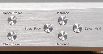 On the right hand side of the panel are the buttons to select from all the options. This includes Store and Recall Preset (you can save your parameter settings and recall them from six memory banks), and then the Select Next and Select Previous for scrolling through the various options. The Increase and Decrease buttons change the values in each option. Once you have all your options selected, you would press Store Preset to save them in memory.