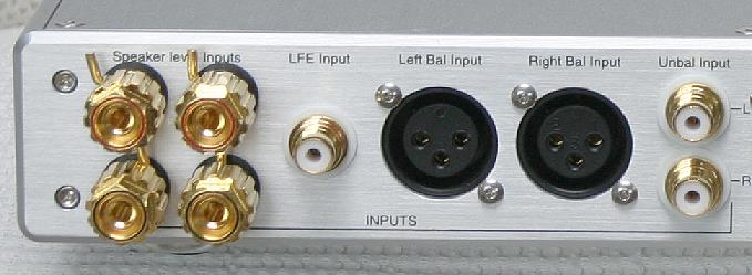 Beginning on the left, are two sets of binding posts that are used if you want to connect the speaker-outputs from your power amplifier to the Integrator rather than a line-level subwoofer-out. They are for use in the Augment Mode, and are shorted with bus bars in the factory setting. Leave them in if you are not using the Speaker Level Inputs, as this reduces noise. Remove them if you are going to use the Speaker Level Inputs. This is followed by the LFE input, XLR inputs for Left and Right channels, and Unbalanced Inputs for Left and Right.