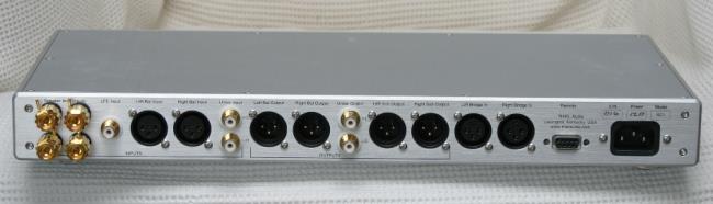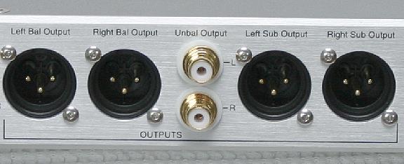 In the middle of the panel are XLR outputs for Left and Right channels and Unbalanced outputs for Left and Right (these would be used when Crossover is enabled, going to the main left and right channel power amplifiers), and XLR outputs for Left Subwoofer and Right Subwoofer when using the Augment Mode. There are no speaker-level outputs for use in the Crossover Mode.