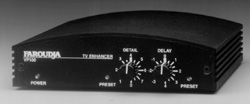 Faroudja VP-100 TV Enhancer; 1 Composite input; 1 Composite output, 2 S-Video outputs; 1 Detail Control, 1 Delay Control; 6.1"W x 1.6"H x 5.9"D; Weight 1.5 lbs.; External power supply (120VAC, 60 Hz, 20 W, 9 VDC @ 650 mA); $799; Faroudja Laboratories, Inc.; 750 Palomar Avenue, Sunnyvale, CA 94806; Telephone: (408) 735-1492; Fax: (408) 735-8571
