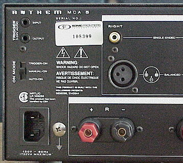 The Anthem MCA-5 is a five channel, 170 watt per channel, amplifier aimed at the home theater market. It has a simple brushed aluminum front plate, with the logo, on/off push button, and a small LED to indicate power-on. The rear panel has a toggle for selecting auto-power on, trigger, or normal, so you don't have to switch it on manually if you don't want to. Each of the five channels has a choice of RCA unbalanced input or balanced XLR input, although the amplifier is not fully balanced. (Sonic Frontier's upcoming SF Chanel 5 will be fully balanced, each channel having two mono amps that are bridged.) One set of speaker binding posts is at the bottom of each channel. The jacks are gold-plated, and the binding posts are standard plastic.