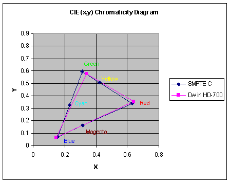 Notice on the CIE diagram in Figure 1 that the HD-700 phosphors do not quite line up with SMPTE C. The green phosphor is positioned a bit close to yellow and the red is also closer to reddish-orange. By using color filters, manufacturers can bring the green and red closer to SMPTE C.